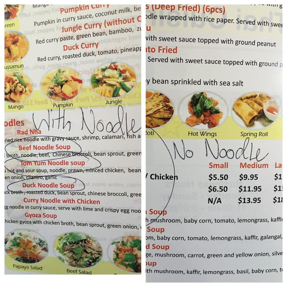 Coconut milk and sour soup, noodle, prawn, chicken, mushroom, baby corn, tomato, cilantro.